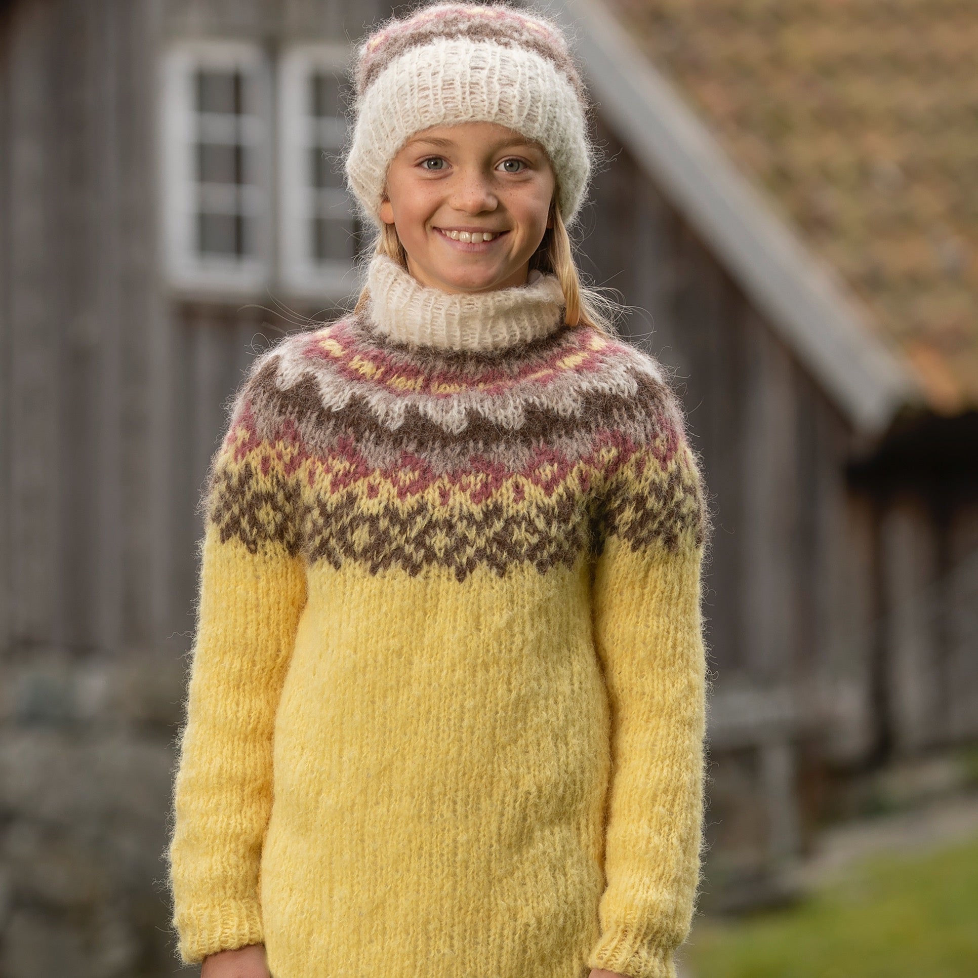 I pakken får du med Alpaca Maya i gul (farge 744), brun (farge 7008), naturhvit (farge 702), rødbrun (farge 758), beige (farge 707), samt mønster (levert digitalt).