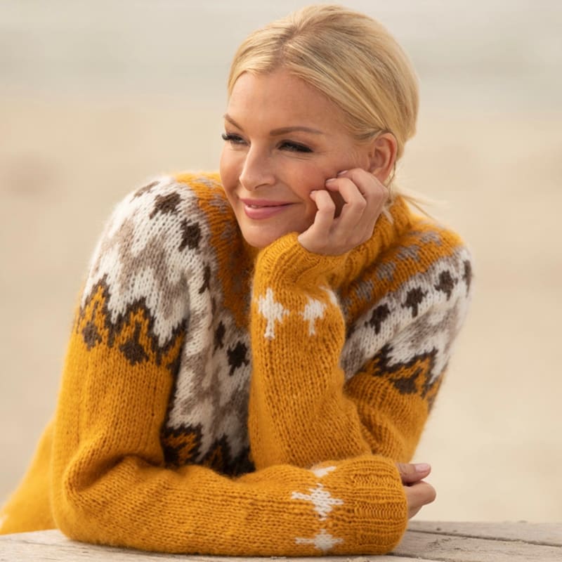 I pakken får du med Alpaca Bris i okergul (farge 345), naturhvit (farge 302), brun (farge 308), og beige (farge 307), samt mønster (levert digitalt).