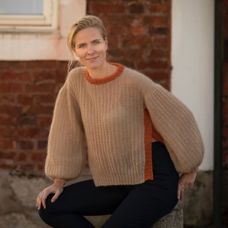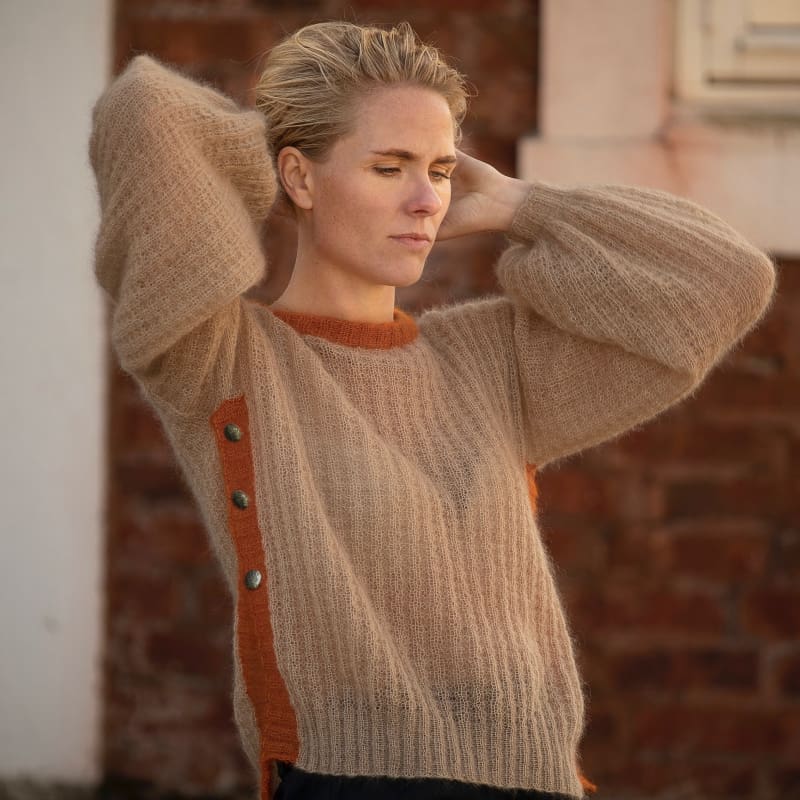 I pakken får du med Kid / Silk i beige (farge 306), brent oransje (farge 355), samt mønster (levert digitalt). Garnmengde (og pris) er avhengig av størrelse og iht leverandørens spesifikasjon/mønster basert på oppgitt strikkefasthet. (20 m glattstrikk i bredden på pinne nr 4 måler ca 10 cm med dobbel tråd.)