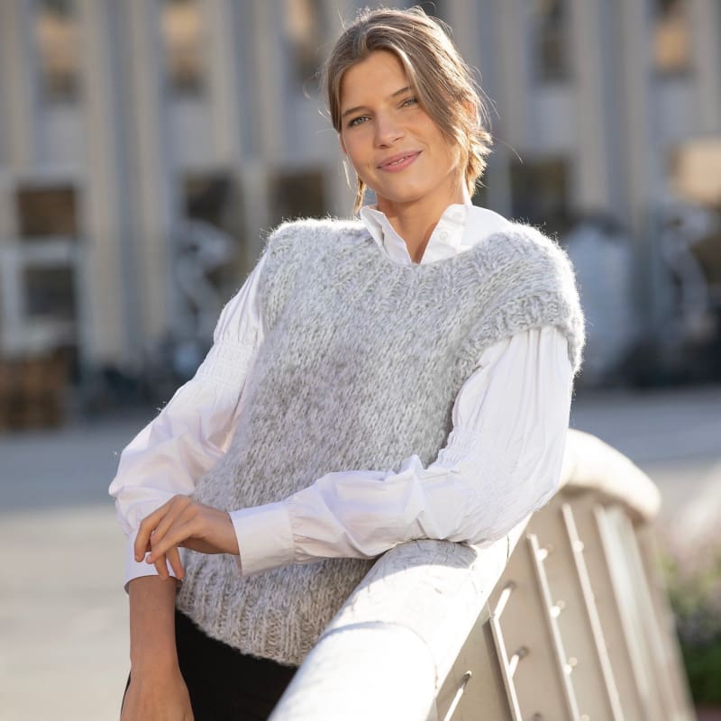 I pakken får du med Alpaca Bris i lys grå (farge 313),  Alpaca Maya i hvit (farge 700), samt mønster (levert digitalt).