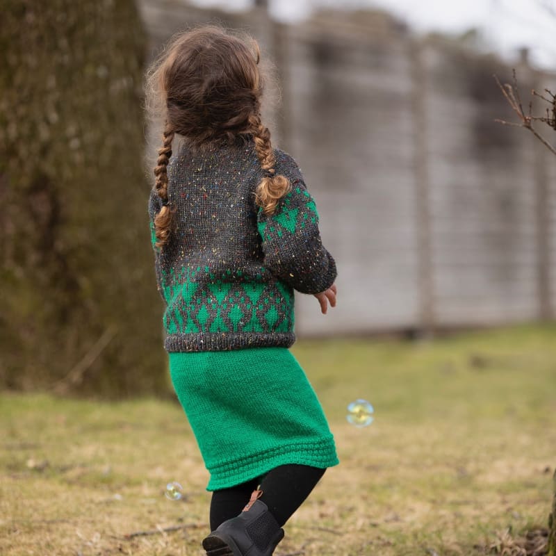 I pakken får du med Eco Highland ull i grønn (farge 230), samt mønster (levert digitalt). (mønster har bilde av kongeblått skjørt)