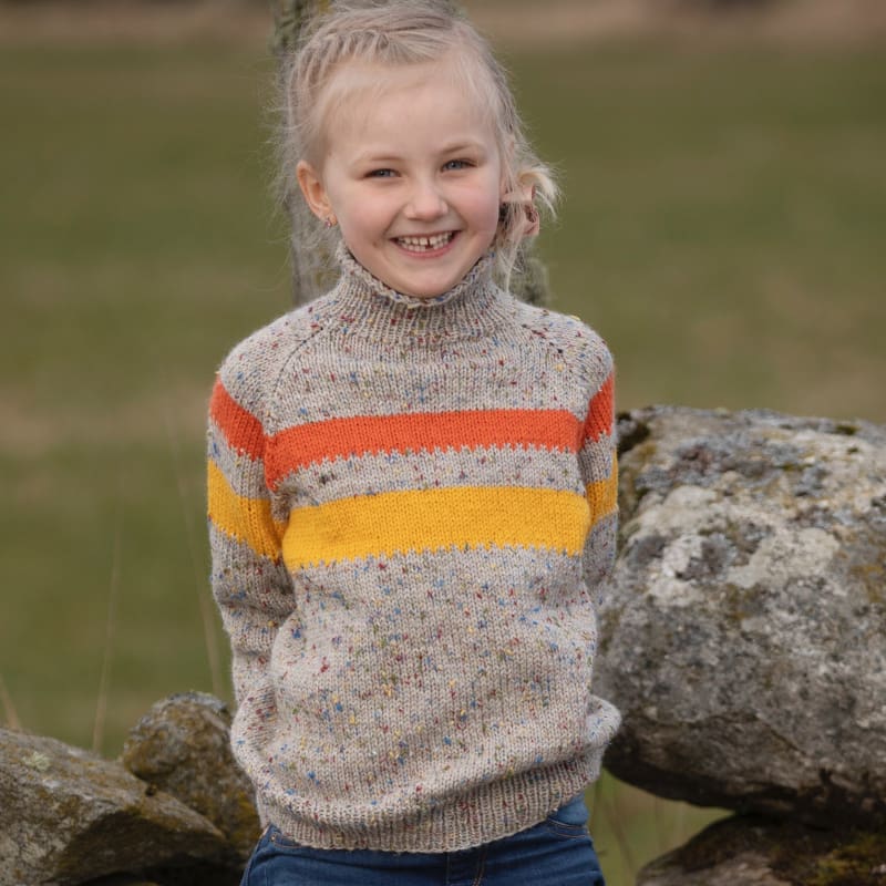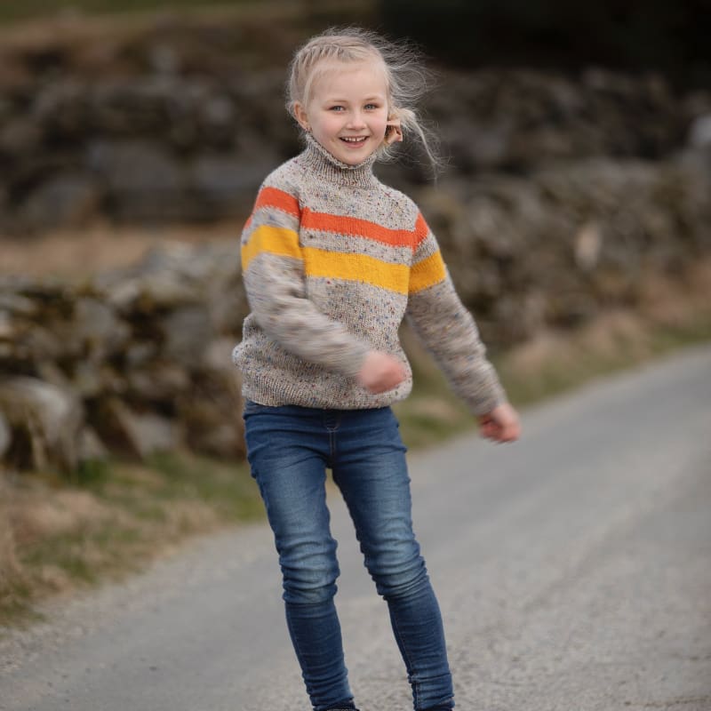 I pakken får du med Eco Highland ull i lys grå tweed (farge 275), oransje (farge 251), gul (farge 245), samt mønster (levert digitalt).