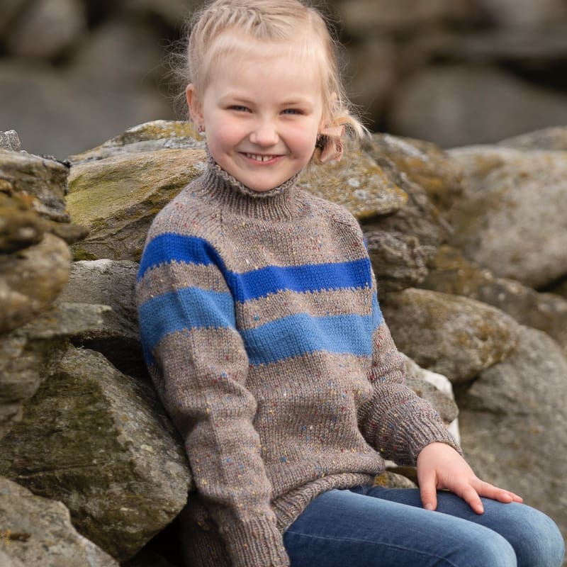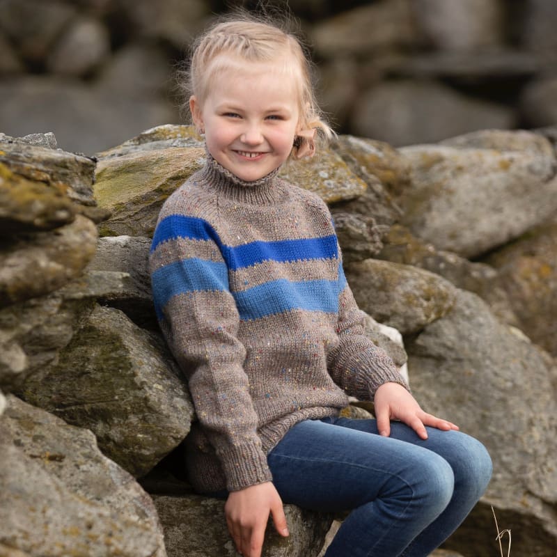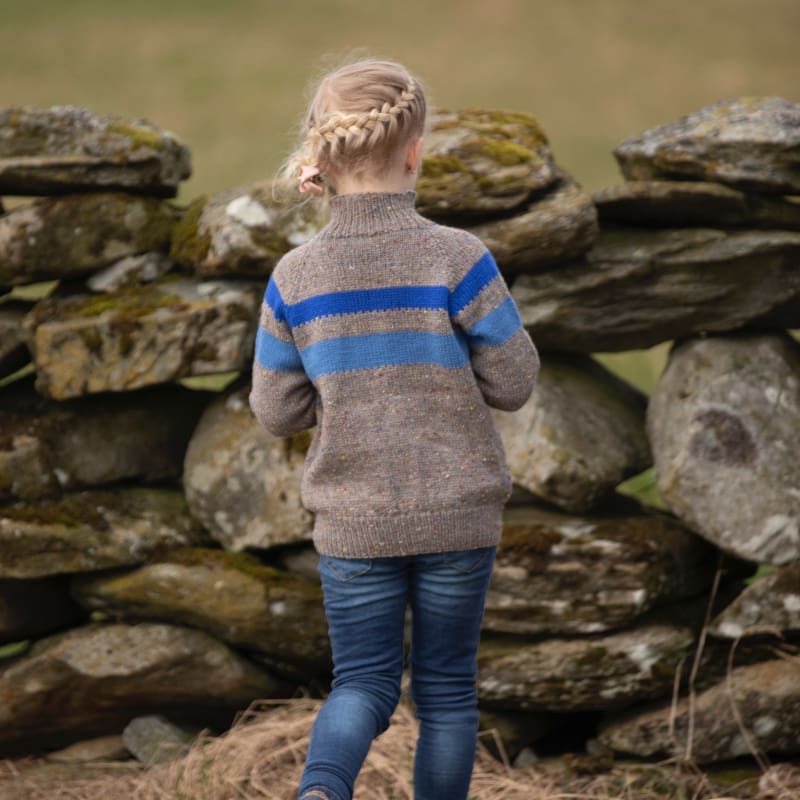I pakken får du med Eco Highland ull i grå tweed (farge 274), mellomblå (farge 223), koboltblå (farge 224), samt mønster (levert digitalt).