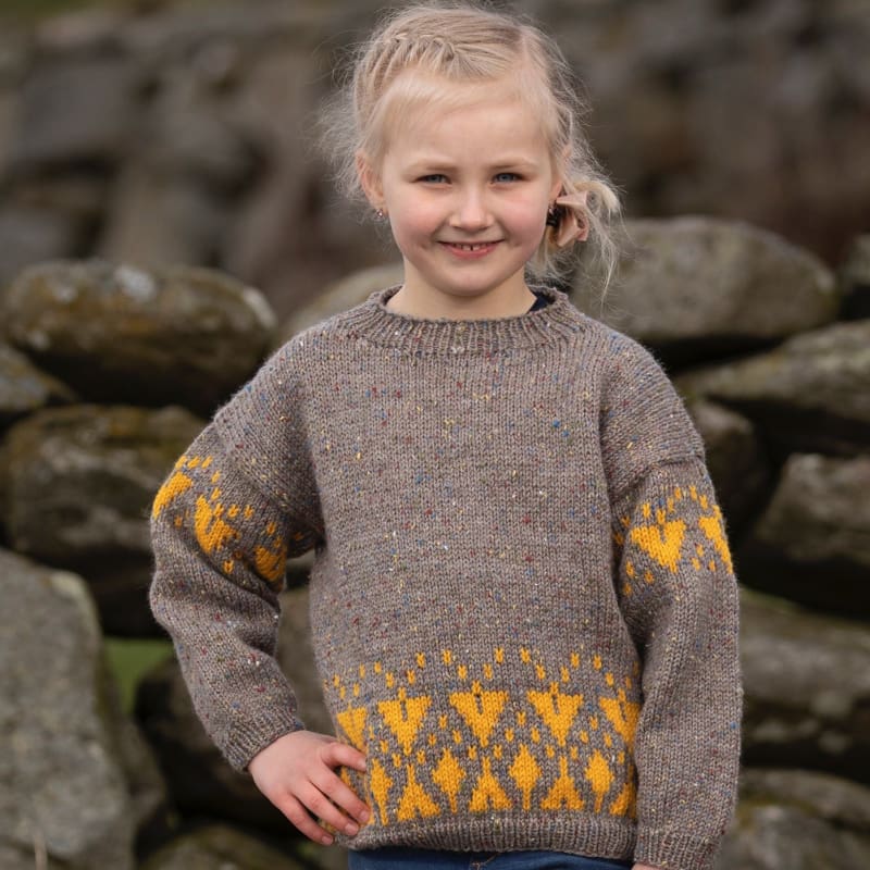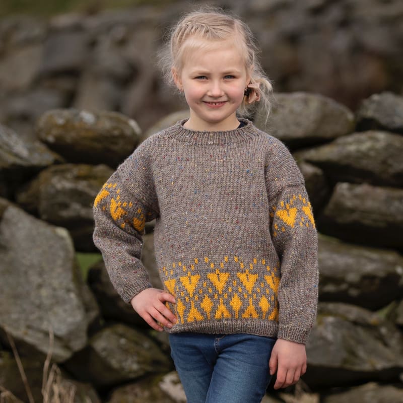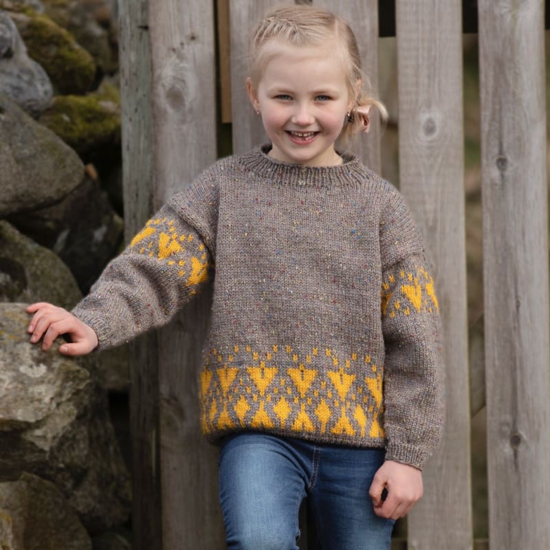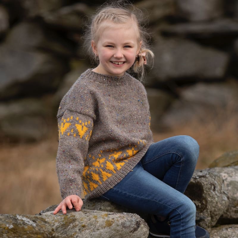 I pakken får du med Eco Highland ull i lys grå (farge 274), gul (farge 245) samt mønster (levert digitalt).