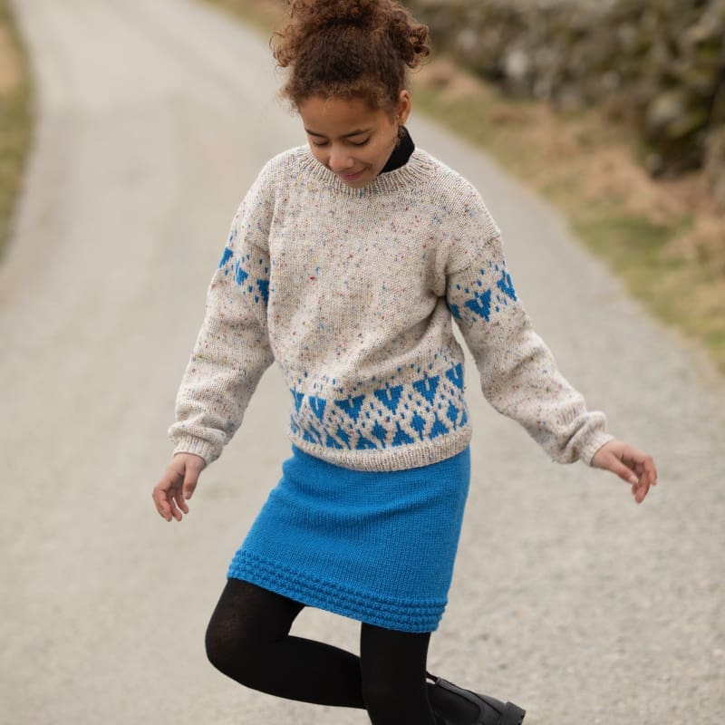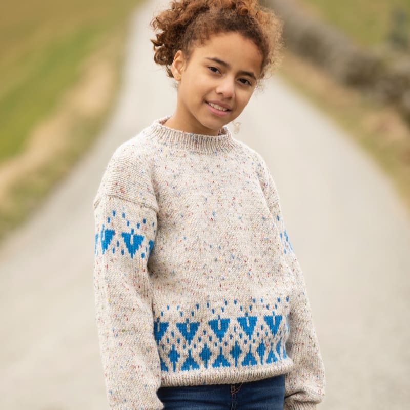 I pakken får du med Eco Highland ull i hvit tweed (farge 270), blå (farge 225) samt mønster (levert digitalt).