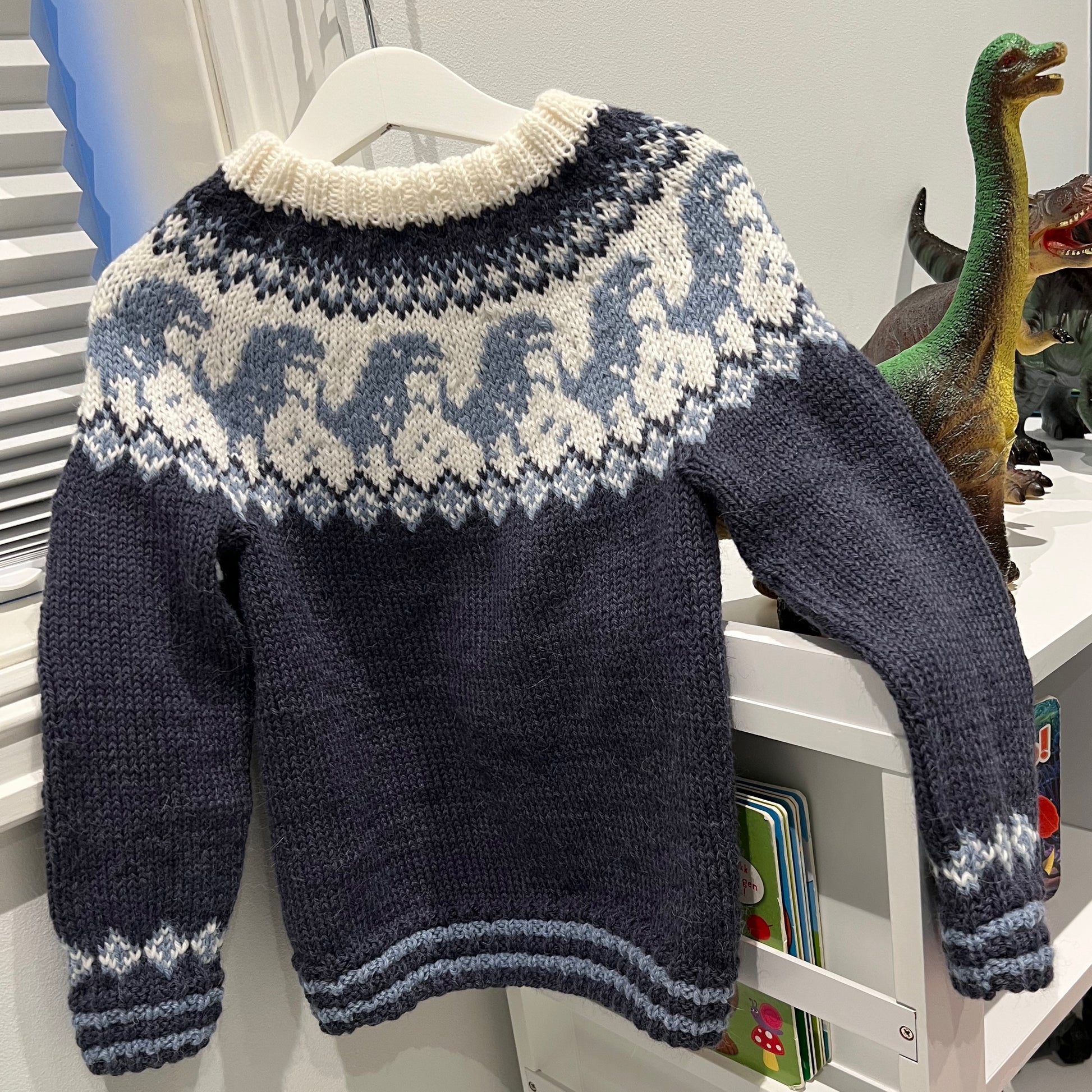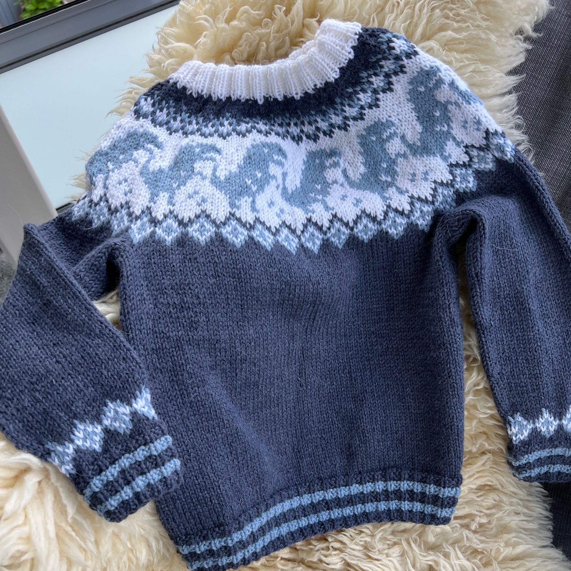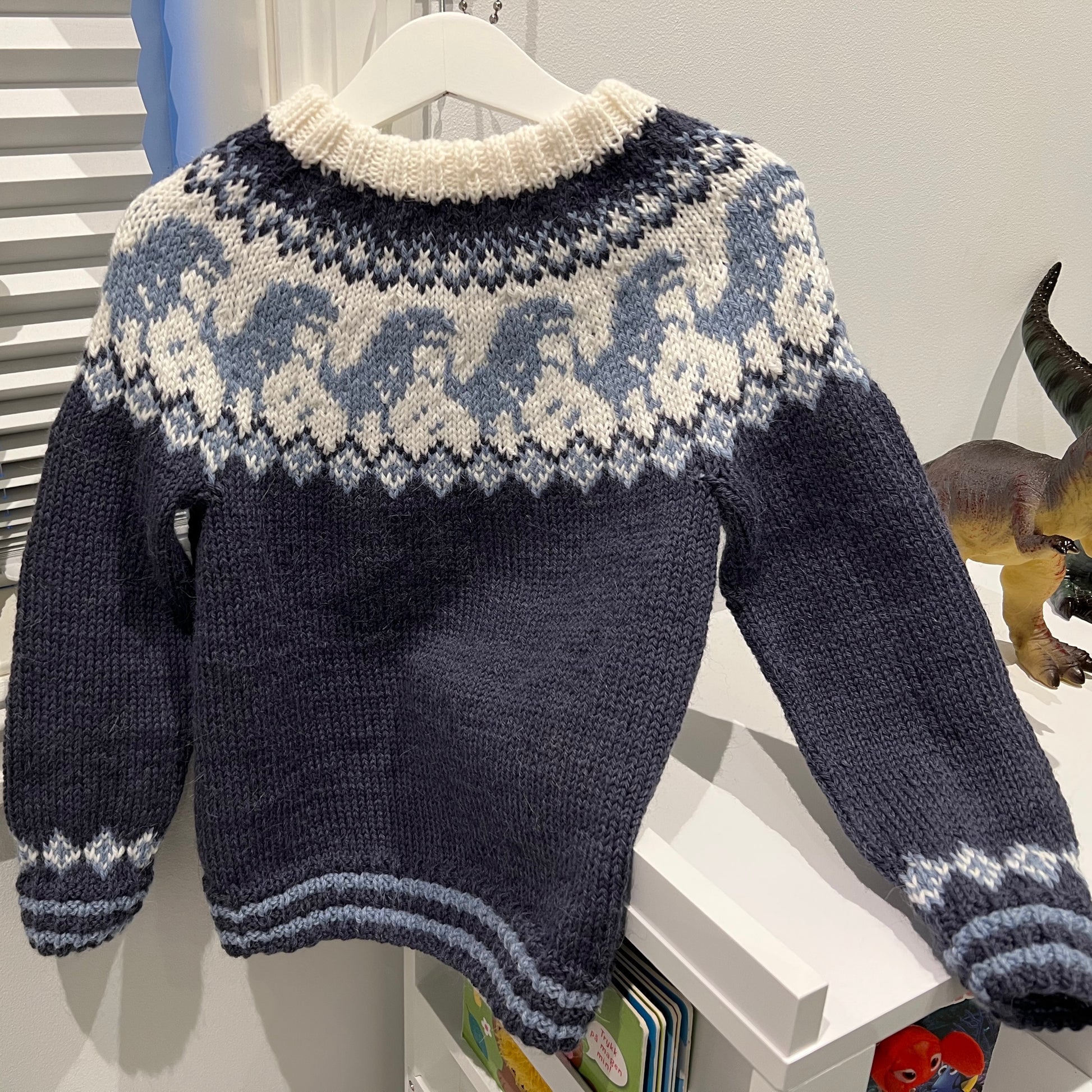 I pakken får du med Viking Alpaca Storm i jeansblå (farge 527),blå (farge 522), hvit (farge 500),  samt mønster (levert digitalt). Garn kun til genser. Ønskes også lue, er mønsteret med i pakken, men vi anbefaler å bestille litt ekstra garn.
