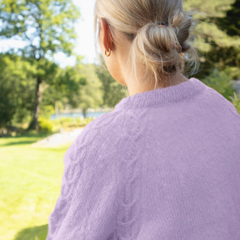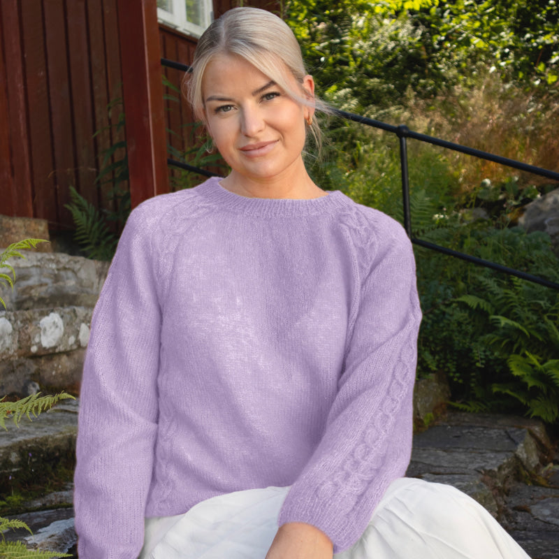 I pakken får du med Kidsilk Erle i lys lavendel (farge 9069), samt mønster (levert digitalt).