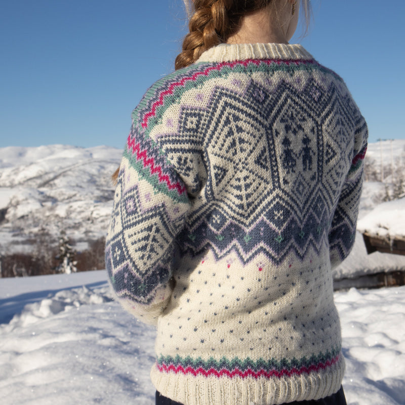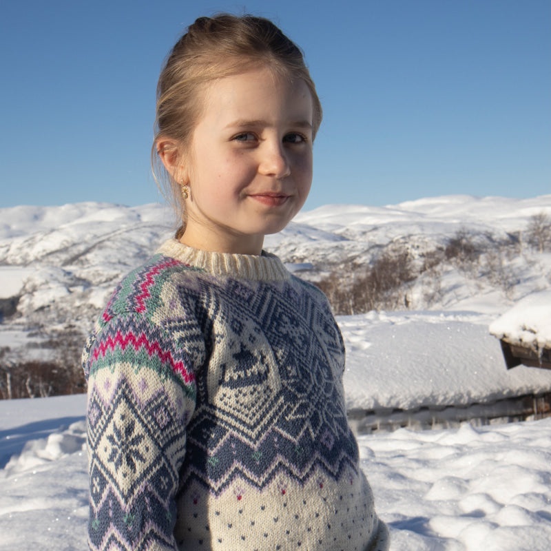I pakken får du med Dale baby-ull i halvbleket hvit (farge 0017), lys lavendel (farge 8532), pink(farge 8534), denimt (farge 8506), petrol( farge 8511), samt mønster (levert digitalt).