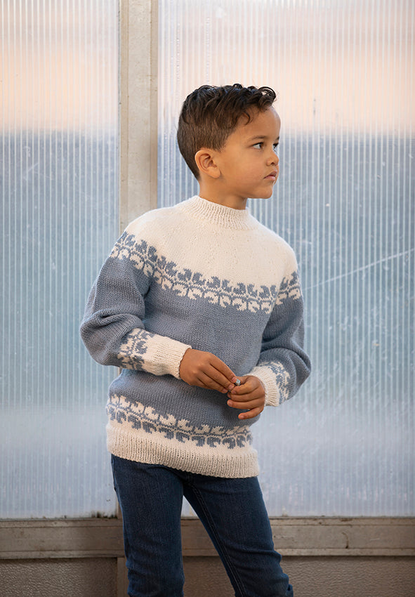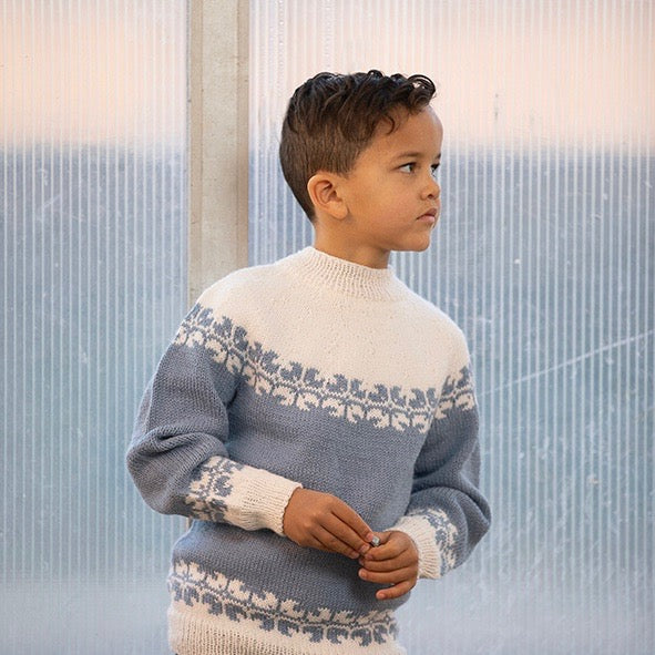 I pakken får du Alpaca Storm i fargen blå (farge 522) og hvit (farge 500), samt mønster (levert digitalt).