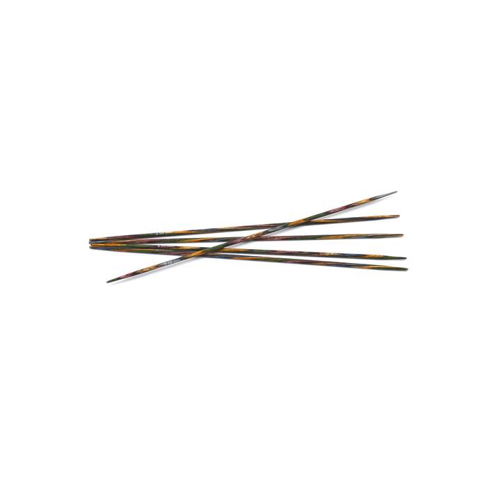 Symfonie Strømpepinner i regnbuefarget laminert bjørk. Pinnene er spisset slik at maskene glir lett på plass, og er utrolig gode å strikke med. Bestselger.