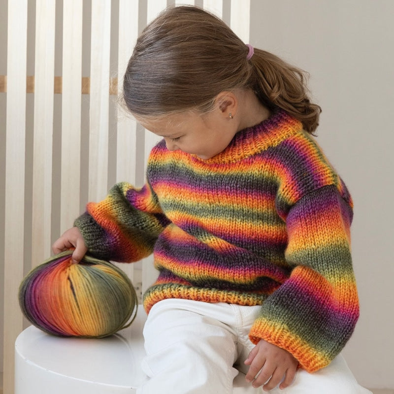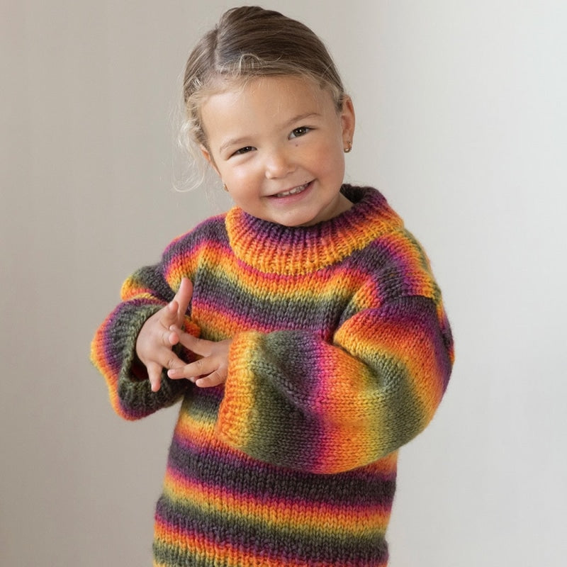 I pakken får du med Alpaca Iris Multi oransje/grønn (farge 458), samt mønster (levert digitalt). Mengde (og pris) er avhengig av størrelse og iht leverandørens spesifikasjon/mønster basert på oppgitt strikkefasthet. (15 m glattstrikk i bredden på pinne nr 6 eller 7 måler ca 10 cm).