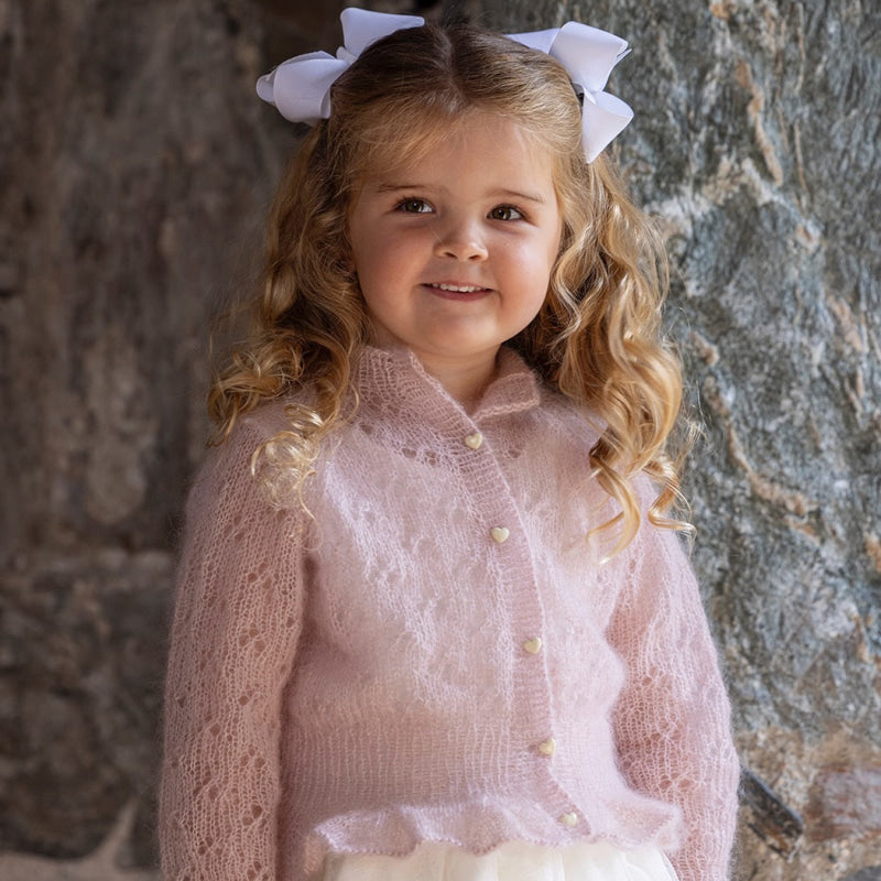 I pakken får du med Viking Kid / Silk i pudderrosa (farge 361), samt mønster (levert digitalt). Garnmengde (og pris) er avhengig av størrelse og iht leverandørens spesifikasjon/mønster basert på oppgitt strikkefasthet. (20 m glattstrikk i bredden med 2 tråder på pinne nr 4 måler ca 10 cm.)