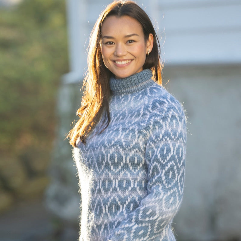 I pakken får du med Alpaca Bris multi blågrå (farge 321), hvit (farge 300), samt mønster (levert digitalt).