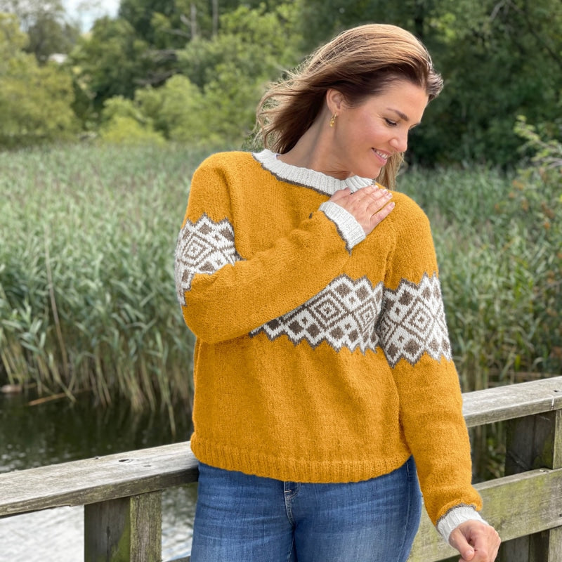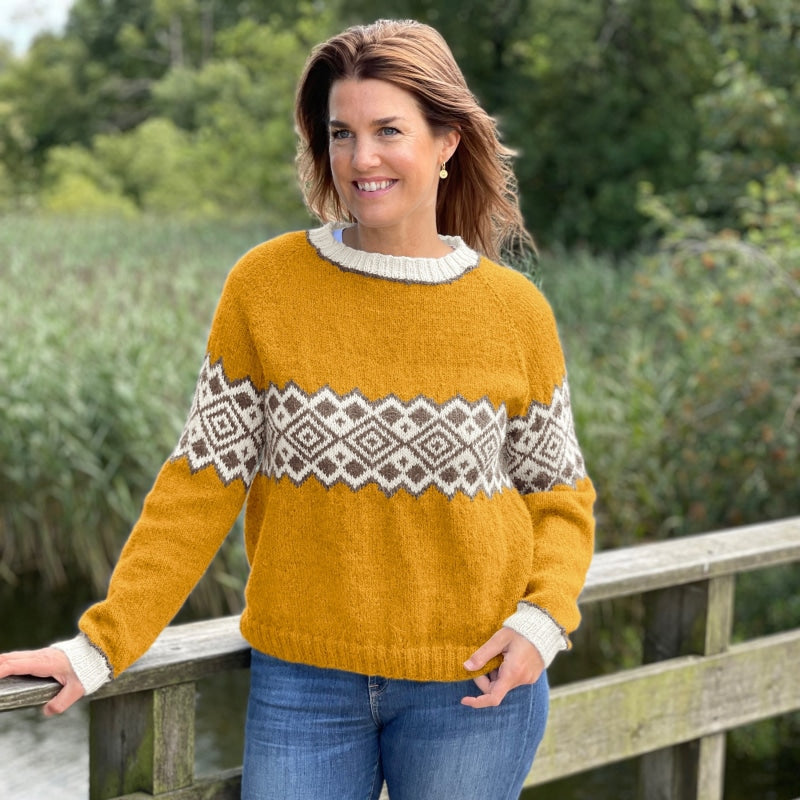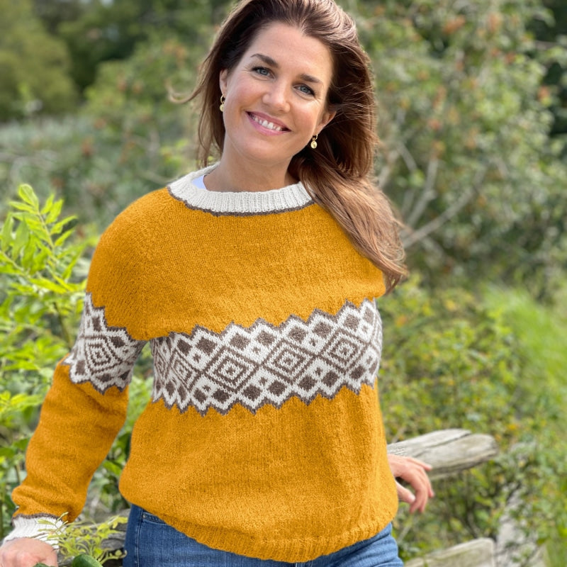 I pakken får du med Sterk fra DSA i gullgul (farge 835), hvit (farge 851), lys brun melert (farge 823), samt mønster (levert digitalt).
