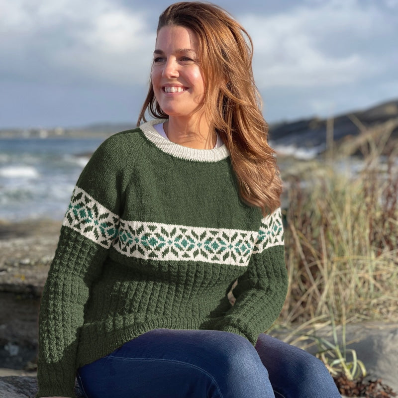 I pakken får du med Sterk fra DSA i flaskegrønn (farge 860), natur (farge 806), grønn melert (farge 888), samt mønster (levert digitalt).